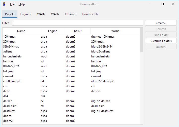 Doomy is a minimalist, preset-based Doom Engine frontend launcher. So minimal, in fact, that it can be run from command-line instead of its normal GUI process!